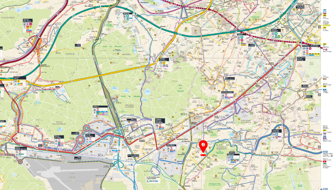 - T10 (10 minutes à pied) : direction le parc départemental de Sceaux et croise le T6 au niveau de l'hôpital Antoine Béclère