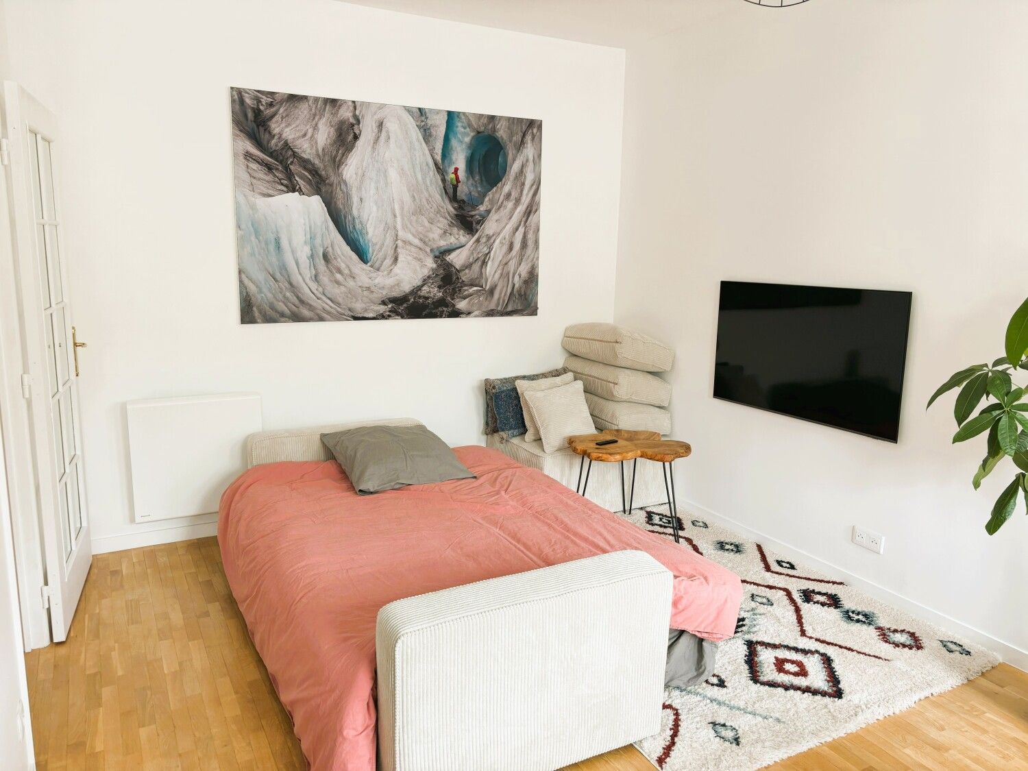 - Un coin télé avec un canapé-lit, une table basse et une télévision